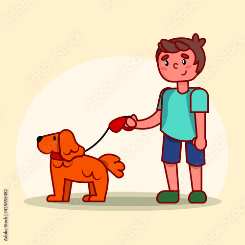 A boy walks with his dog. Everyday scenes with pets. Flat vector illustration.
