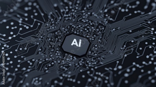 a brain-shaped circuit board with an text "AI" chip at the center