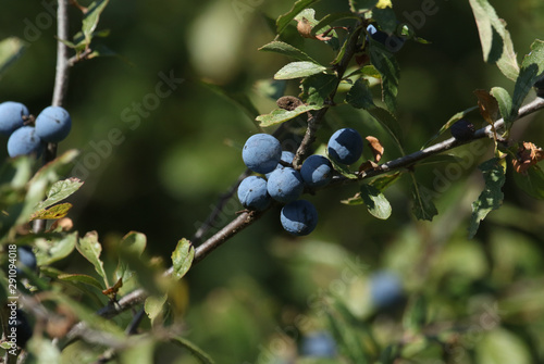 A branch of ripe Blackthorn or Sloe, Prunus spinosa, growing in the wild in the UK.