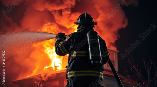 firefighter, fire, flames, house, night time, bravery, emergency, response, water, hose, rescue, smoke, safety, gear, courage, destruction, firefighting, heat, danger, light, shadow, community, service, action, urgency, inhalation, teamwork, equipment, heroism, technique, containment, hazard, department, vigilance, training, disaster, rising, zone, urban, night, operation, public, first, strategy, dedication, crisis, support