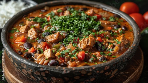 A Brazilian feijoada stew with black beans, pork, and rice, rich flavors and textures