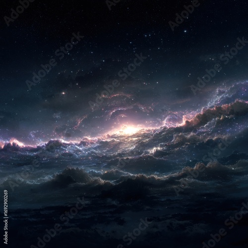 A breathtaking cosmic landscape, showing swirling nebulae and distant starlight
