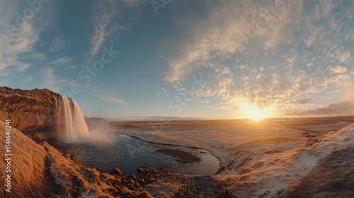 A breathtaking HDR shot of Seljalandsfoss waterfall, bathed in the warm light of a sunset in Iceland. Ideal for nature, travel, or adventure-themed ads.