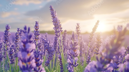 A breathtaking landscape of endless lavender rows swaying gently under the golden sunlight.
