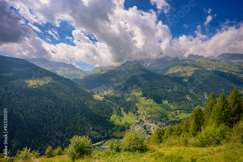 A breathtaking panoramic view of the Italian Alps during an alpine crossing from Italy to Switzerland. The lush green valleys, dense forests, and towering peaks create a stunning natural landscape.