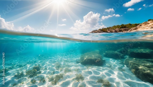 A breathtaking split-view image showcasing a tranquil underwater scene blending with a sunny, vibrant sky above, highlighting the serene beauty of the sea and a pristine natural environment.