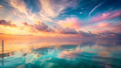 A breathtaking sunset over a calm ocean, with vibrant colors reflected in the tranquil water, creating a serene and peaceful seascape