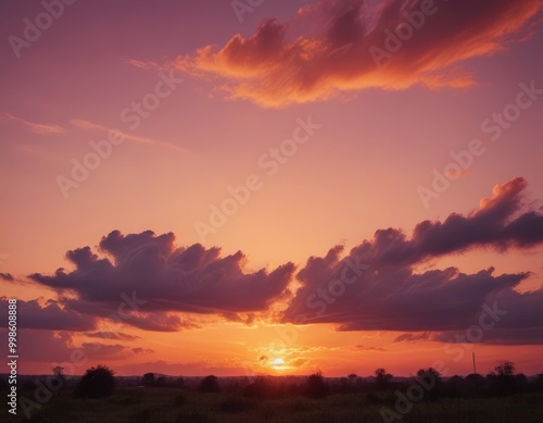 A breathtaking sunset over a field, with vibrant orange and pink hues illuminating the sky and casting long shadows on the grass below