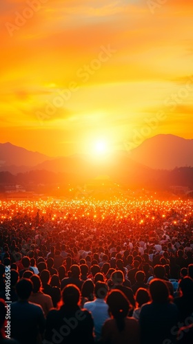 A breathtaking sunset over a large crowd, capturing the beauty of twilight and the vibrant energy of outdoor gatherings.