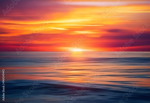 A breathtaking sunset over the ocean, with vibrant hues of orange, yellow, and red reflecting on the calm water surface.