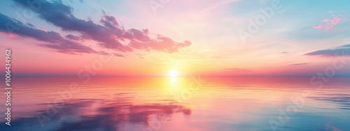 A breathtaking sunset over tranquil ocean waters, featuring a vibrant sky filled with soft colors. This serene landscape evokes peace and invites contemplation.