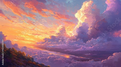 sunset, cloud, sky, sunrise, orange, pink, purple, colours, light, horizon, landscape, aerial, view, nature, painting, art, digital, impressionism, fluffy, cumulus, thundercloud, vibrant, high-coloured, warm, cool, gold, dramatic, atmosphere, texture, detail, elevation, river, hill, forest, tree, peaceful, serene, fantasy, imagination, dreamy, pastel
