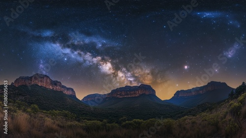 A breathtaking view of a starry night sky over a quiet mountain range, the Milky Way glowing above, adding depth and wonder,