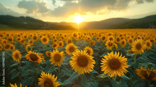 A breathtaking view of a sunflower field with the sun setting behind the mountains, casting a golden glow over the yellow flowers and clear blue sky.
