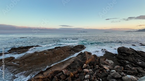 A breathtaking view of a tranquil ocean at dusk, featuring waves crashing against the rocky shoreline.