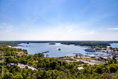 A breathtaking view of Parry Sound's stunning Georgian Bay from the lookout tower, showcasing the serene beauty of Ontario's natural landscapes.