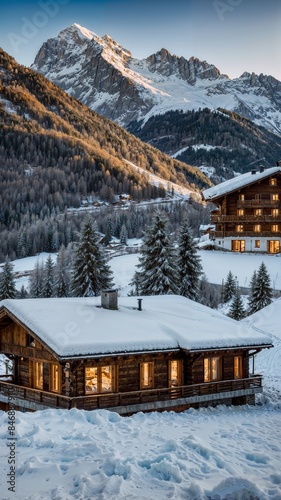 A breathtaking view of the Swiss Alps along with luxurious wooden cabins