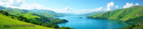 A breathtaking vista of rolling green hills, a vibrant blue sky, and a serene lake reflecting the natural beauty Perfect for travel, nature, and landscape projects , ecology, magnificent, trees
