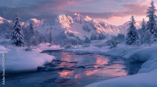 A breathtaking winter sunrise paints the sky in hues of pink and purple, reflecting beautifully on a pristine river flowing through a snow-covered mountain valley.