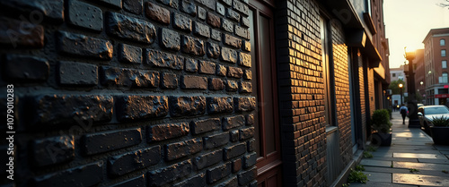 A brick wall with a black paint job. The wall is next to a sidewalk and a street