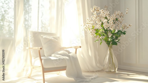 A bright, airy room with a white chair in front of a window, a vase of flowers on a table providing a delicate accent.