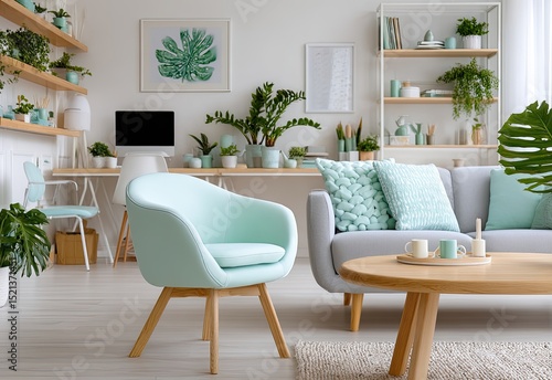 A bright and airy living room with white walls, green accents, a wooden coffee table, two pastel chairs in light blue or mint green, an indoor plant on the sideboard
