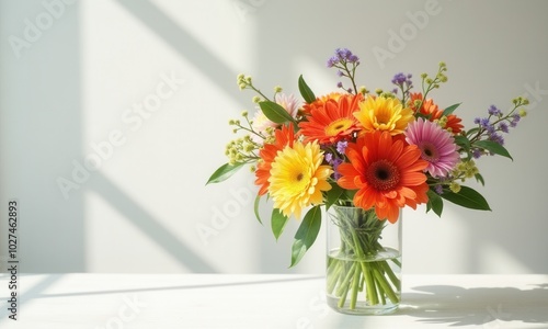 A bright flower bouquet in a glass vase under sunlight.