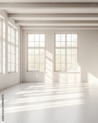 A bright, minimalistic interior space with large windows allowing natural light to illuminate the white walls and floor.