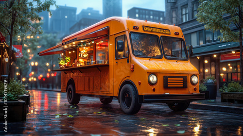 A bright orange food truck parked on a rainy, bustling street in the city. Nighttime ambiance with warm lighting
