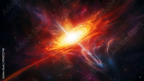 A bright quasar at the center of a galaxy with glowing dust and gas swirling around