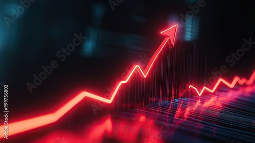 A bright red arrow streaks upward along a growth chart with a glowing target at the peak. The scene depicts financial or business success and the excitement of hitting goals.