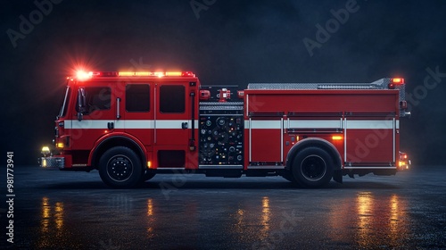 A bright red fire truck, side view, standing out against a dimly lit backdrop.