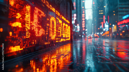 A bright stock market ticker reflects on a rainy city street, capturing urban lights and financial trends in a vibrant night scene