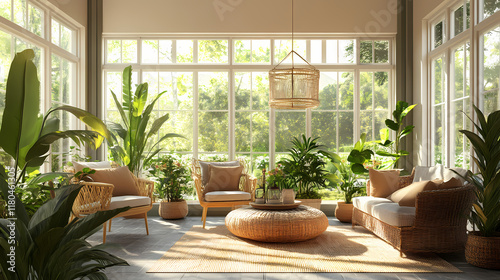 A bright sunroom with wicker furniture, indoor plants, and large windows letting in plenty of natural light. Solarchime. Illustration
