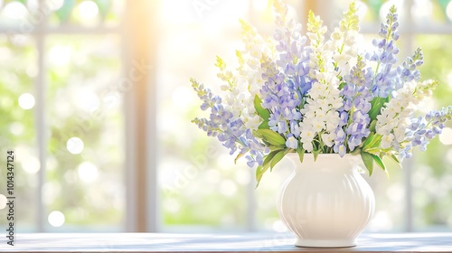 A bright vase filled with purple and white flowers, illuminated by soft sunlight, creating a serene and cheerful atmosphere.