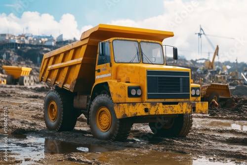 A bright yellow dump truck on a muddy construction site, with workers and equipment visible in the distance