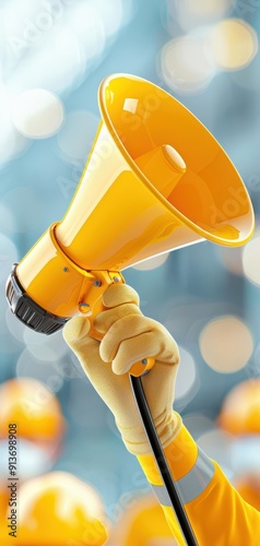 A bright yellow megaphone held high, ideal for announcements or calls to action in various environments.