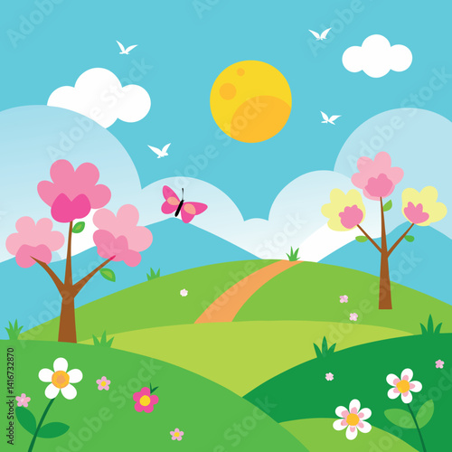 landscape, sky, spring, flower, summer, grass, nature, vector, field, meadow, sun, cloud, illustration, cartoon, tree, day, season, flower, floral, hill, sunlight, lawn, butterfly, plant, design