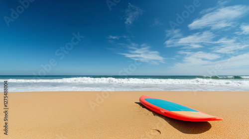 A brightly colored surfboard resting on soft golden sand, with gentle waves rolling in the background under a bright blue sky, evoking a relaxed beach vibe.