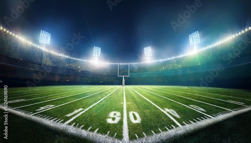 A brightly lit football field showcasing yard lines and goalposts, set in a stadium atmosphere ready for a game.
