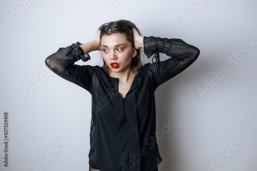 girl, background, grey, white, isolate, lip, red, black, blouse, brunette, hair, long, blond, big, eye, look, woman, young, shirt, portrait, face, copy, space, copy space, person, female, caucasian, model, pretty, beauty, fashion, glamour, make-up, head, attractive, hand, lady, isolated, studio, copy space, cute, head shot, mouth, lipstick, sensual, vogue, eye, lip, skin