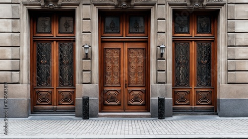 A building facade featuring symmetrical wooden doors with intricate carvings and ironwork, set within a stone surface. There are two wall-mounted lamps flanking the central entrance.