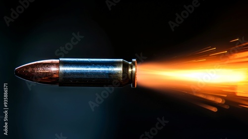 bullet, flight, trail, fire, orange, bright, dark, background, black, copper, metal, casing, projectile, speed, motion, impact, energy, power, force, explosion, combustion, heat, light, spark, muzzle, flash, smoke, firearm, weapon, munition, danger, risk, war, crime, violence, destruction