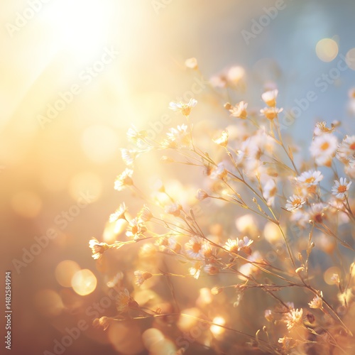 shining, sunrise, meadow, sunlight, rural, morning, light, wild, white, sun, floral, sunset, flower, bunch, sunny, yellow, beauty, flora, grass, green, field, bright, nature, plant, season, spring, background, summer, fresh, garden, countryside, landscape, closeup, autumn