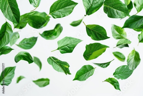 A bunch of green leaves suspended in mid-air, ideal for environmental or nature-themed projects