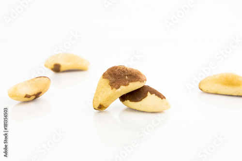 A Bunch Of Healthy Brazilian Nuts On White Background With Reflection