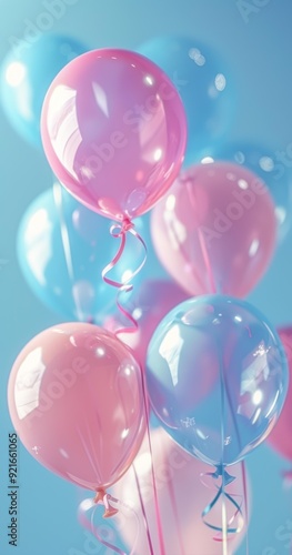 A bunch of pastel pink and blue balloons float against a light blue sky, Perfect for celebrations, gender reveal parties, birthdays, and festive decorations,