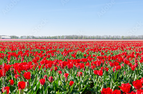 A bunch of red tulips in Holland. Huge field full of beautiful flowers in bloom