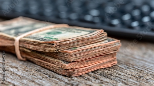 money, currency, banknote, cash, bill, paper, finance, payment, economy, wealth, cashflow, transaction, financial, business, stack, bundle, aged, worn, rustic, wooden, surface, keyboard, blurred, background, paperwork