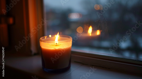 A burning candle, delicately placed on the window sill, casts a soft and gentle glow, illuminating the surrounding space with grace and tranquility.